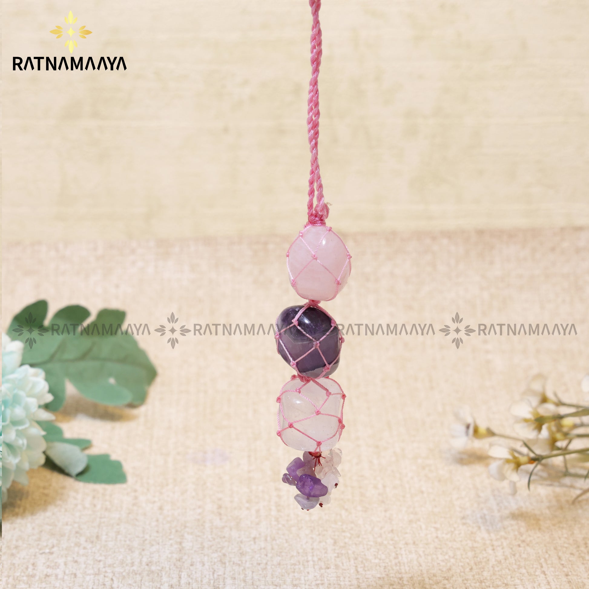 The Love Relation Peace Hanger is a soft, pastel strand of crystals—typically Rose Quartz, Amethyst, and clear or milky Quartz—carefully net‑wrapped in pink cord and finished with a cluster of tiny chips at the base. Designed to hang by windows, bedheads, doorways, or altar spaces, it brings a gentle, heart‑centred vibration into the room while adding a subtle, romantic touch to your décor.