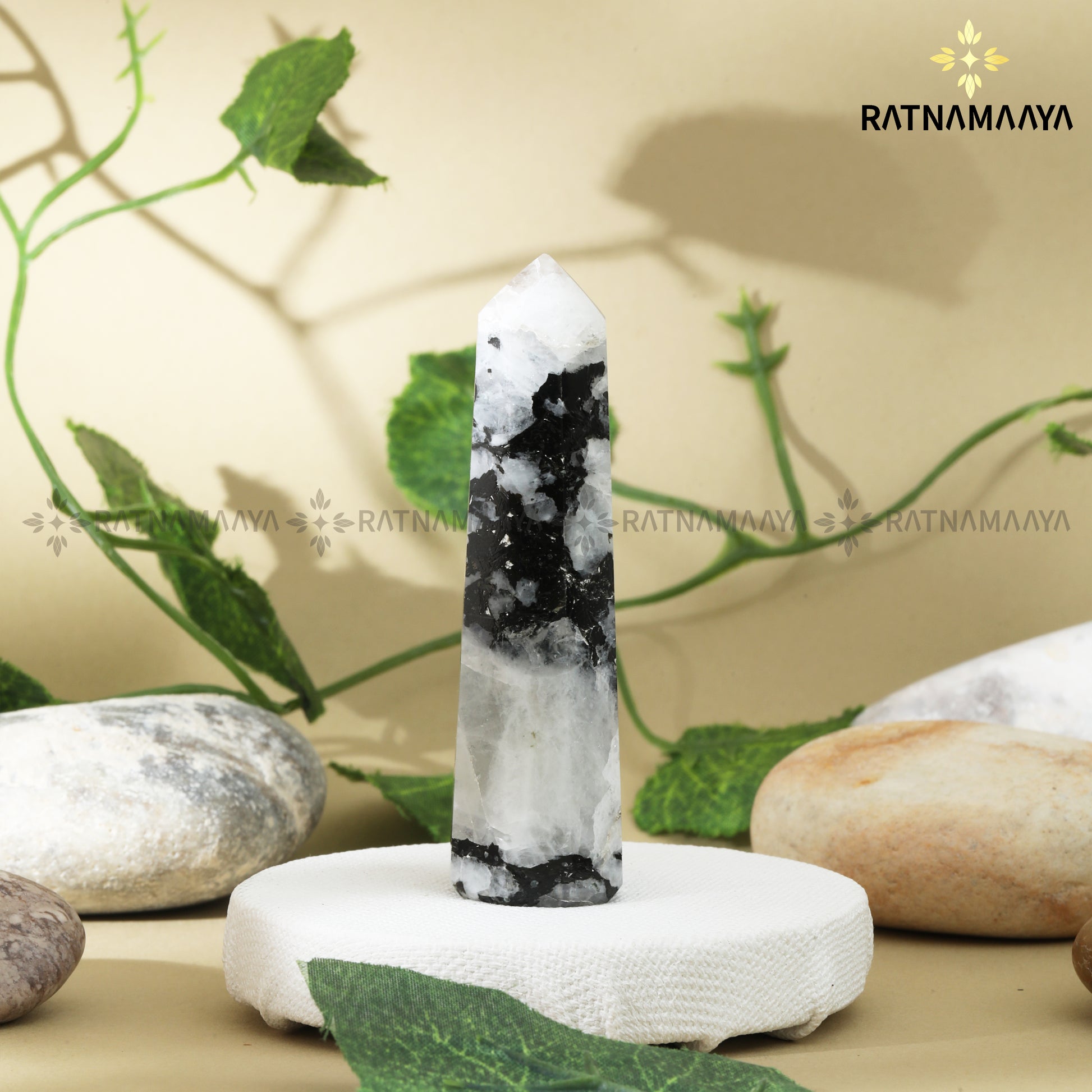The Rainbow Moonstone Pencil is a polished crystal tower in soft white with striking black inclusions and flashes of iridescent blue, carved into a sleek obelisk with a pointed tip. This elegant piece is ideal for altars, bedside tables, and meditation spaces, where it adds a luminous, mystical presence while focusing the stone’s energy through its point.